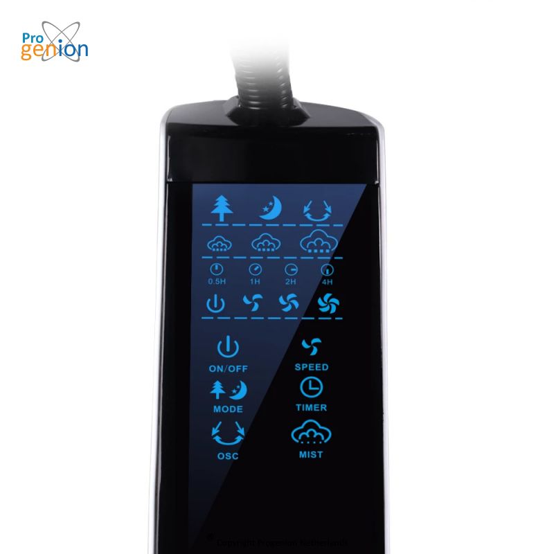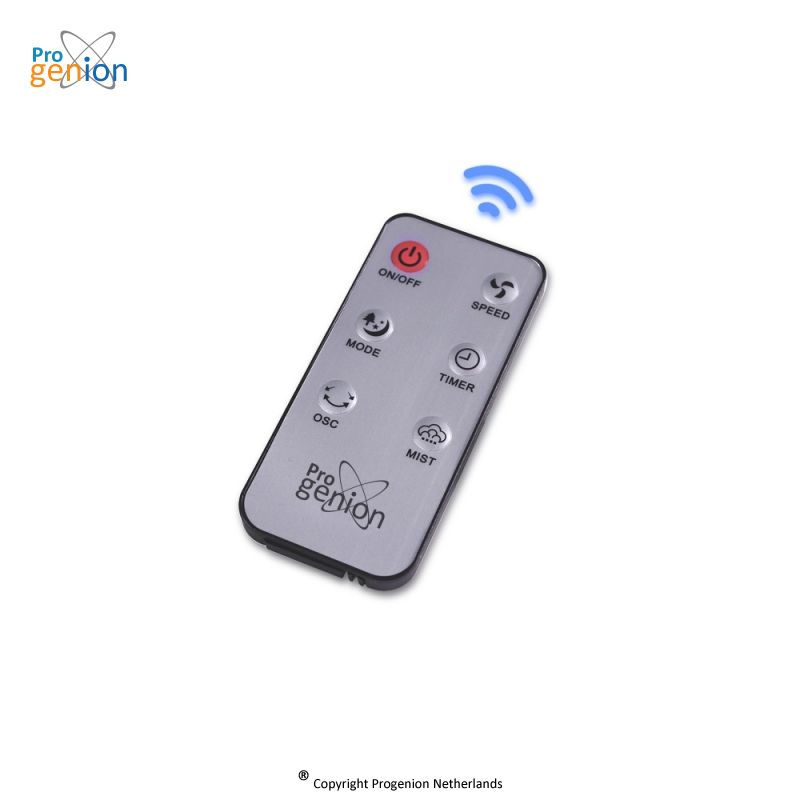 Ventilateur brumisateur de luxe pour un rafraîchissement agréable. Le Progenion PR-40RA est votre partenaire idéal pendant les chaudes journées d'été. Ce ventilateur de luxe est doté d'un ventilateur 3 vitesses et d'une fonction d’atomisation d'eau réglable séparément. L'atomisation procure un effet rafraîchissant agréable pendant les chaudes journées d'été. Outre l'atomisation, ce ventilateur dispose également de diverses fonctions telles qu'une fonction rotation, minuterie, veille et vent naturel. Grâce à son moteur 100 % en cuivre associé à un ventilateur 5 pales, le ventilateur est très silencieux quand il fonctionne et a une très longue durée de vie. Le ventilateur repose sur 4 roulettes pivotantes et est donc facile à déplacer dans d'autres pièces. En outre, toutes les fonctions du ventilateur peuvent être contrôlées à une distance de 5 mètres à l'aide de la télécommande fournie.